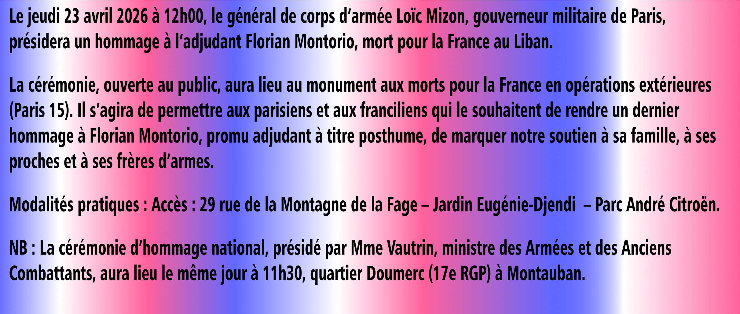 L’UNSOR s’associe avec une profonde émotion à la douleur du 17e régiment du génie parachutiste de Montauban après la mort du sergent-chef Florian Montorio, survenue ce vendredi 18 avril au sud du Liban. Elle adresse ses sincères condoléances à sa famille, à ses proches et à ses frères d’armes, et exprime tout son soutien aux trois militaires blessés.