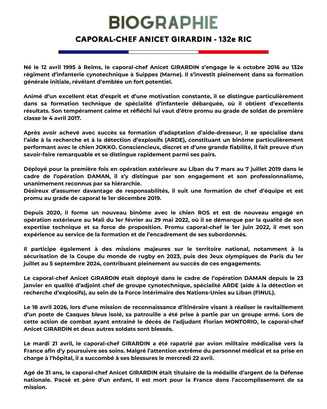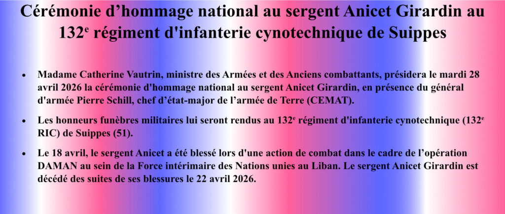 L’UNSOR pleure le caporal‑chef Anicet Girardin, maître‑chien du 132ᵉ régiment d’infanterie cynotechnique de Suippes, âgé de 31 ans, qui a succombé à ses blessures après avoir été la cible de tirs du Hezbollah samedi dernier. Il intervenait pour porter secours à l’adjudant Florian Montorio, mortellement touché quelques instants plus tôt.