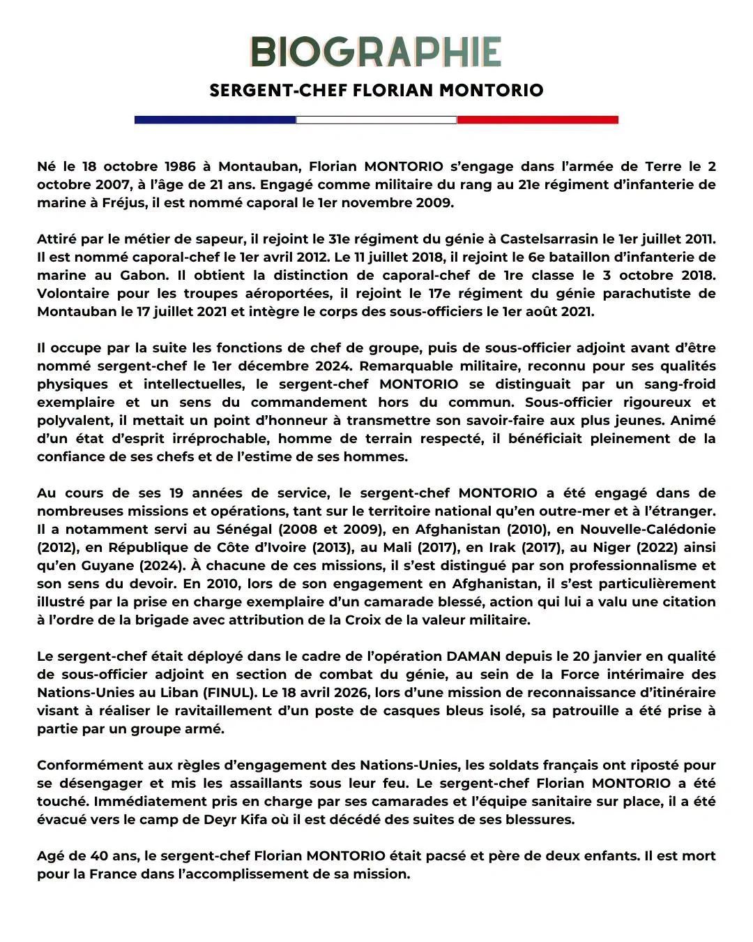 Aujourd’hui, le sergent-chef Florian Montorio est mort pour la France dans le cadre de l’opération DAMAN, engagement français au sein de la Force intérimaire des Nations-Unies au Liban. Pris à partie par des tirs, avec sa patrouille au cours d’une mission d’ouverture d’itinéraire pour ravitailler un poste isolé de casques bleus, et malgré la prise en charge immédiate par ses camarades et les équipes médicales spécialisées, il n’a pas pu être sauvé. Au nom des armées françaises, j’adresse mes condoléances à sa famille, ses proches et ses frères d’armes du @17eRGP. J’ai également une pensée pour ses camarades blessés au cours de cette action qui ont fait preuve d’une grande bravoure.