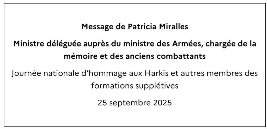 Notre pays a reconnu sa responsabilité dans la tragédie vécue par les harkis et leurs familles et est engagé dans une politique de réparation et de reconnaissance. Cela passe notamment par un examen sans concession du passé dans tous ses aspects et par une transmission objective de l’histoire de toutes les entités qui constituent la communauté nationale. La cérémonie du 25 septembre en est l’expression la plus solennelle.