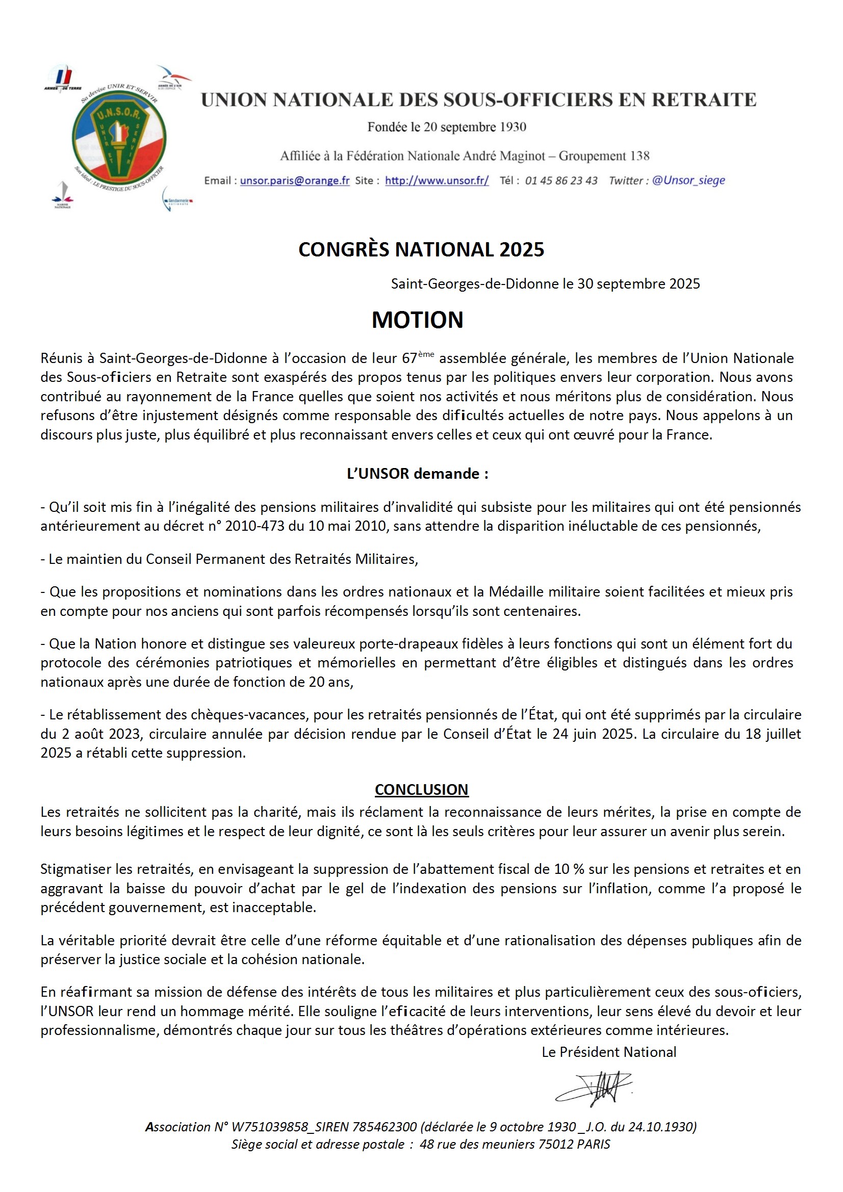 Réunis à Saint-Georges-de-Didonne à l’occasion de leur 67ème assemblée générale, l’UNSOR a rédigé une motion destinée à nos autorités.